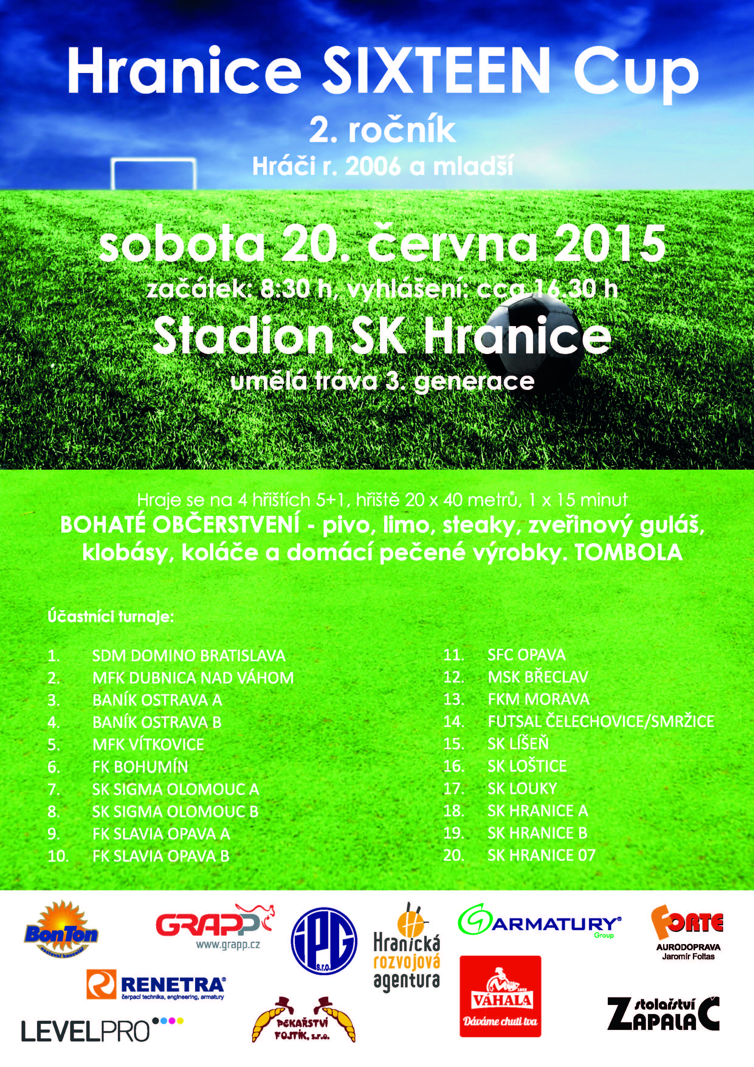 POZVÁNKA - V sobotu 20.6.2015 od 8:30 hod. se uskuteční 2.ročník fotbalového turnaje SIXTEEN Cup pro mladší přípravky U9 (ročník narození 2006)